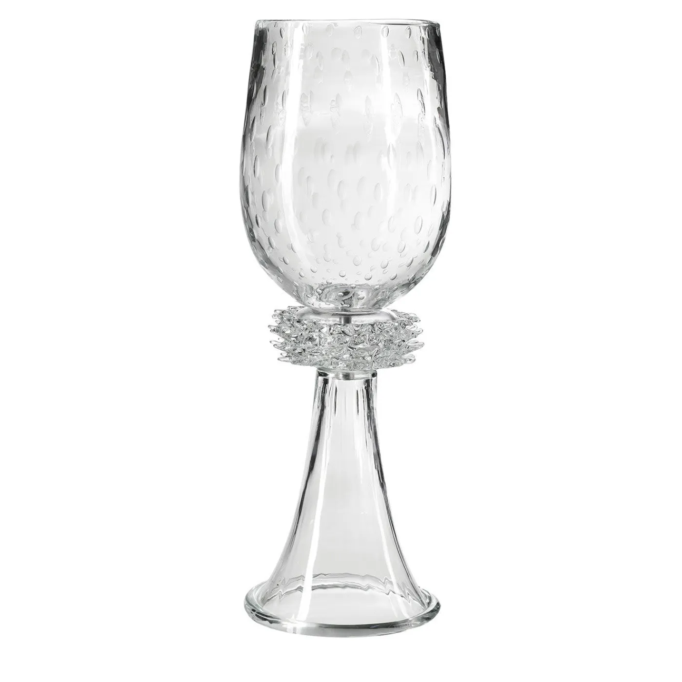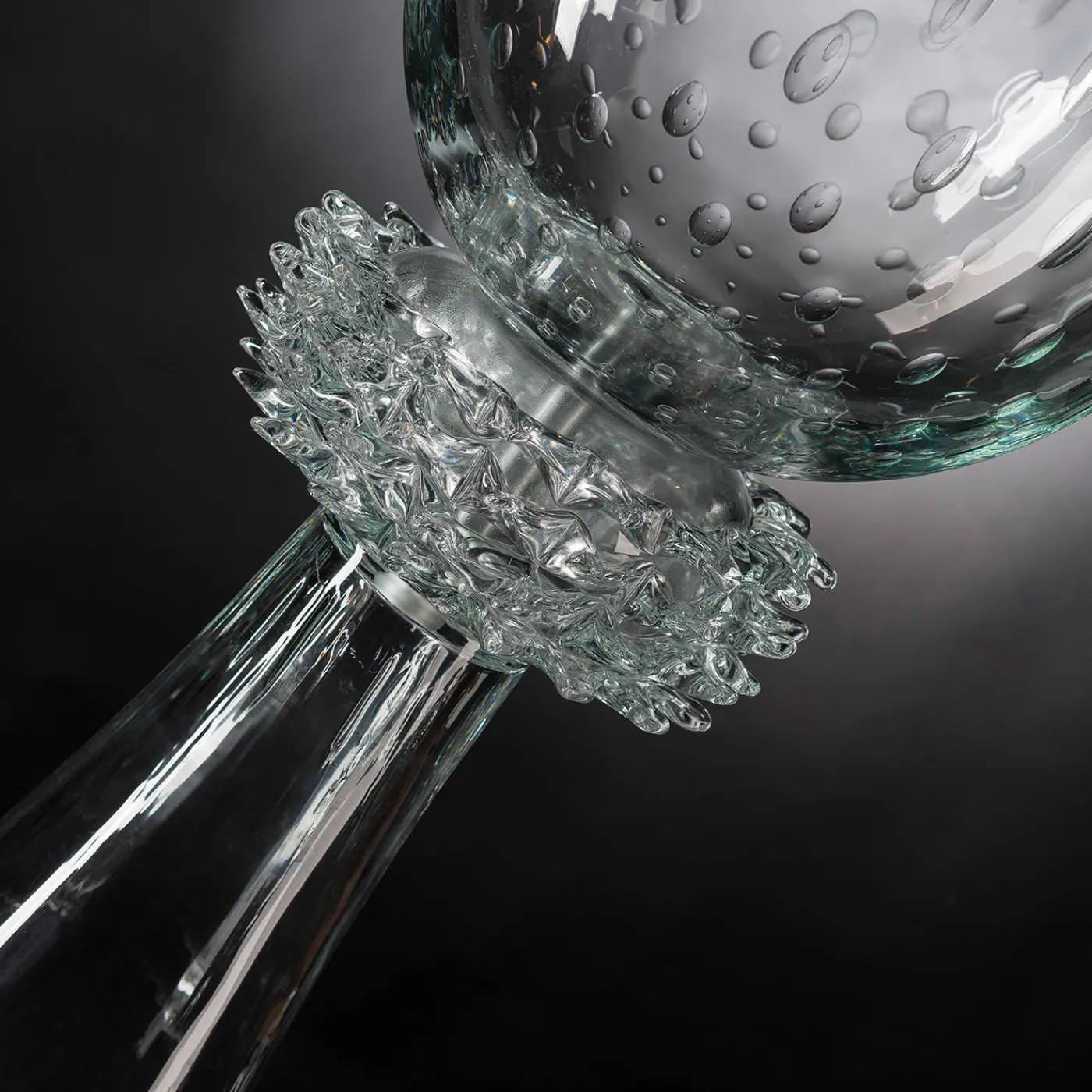 Una superba vetrina di artigianato, questo vaso è squisitamente realizzato a mano in vetro di Murano, un vetro strutturato noto anche come fiorentino. Alto 95 cm, il pezzo poggia su una base a forma di cono arricchita da una decorazione di grande impatto visivo che la collega alla coppa. Questo pezzo può essere utilizzato come centrotavola o vaso in un ambiente moderno.