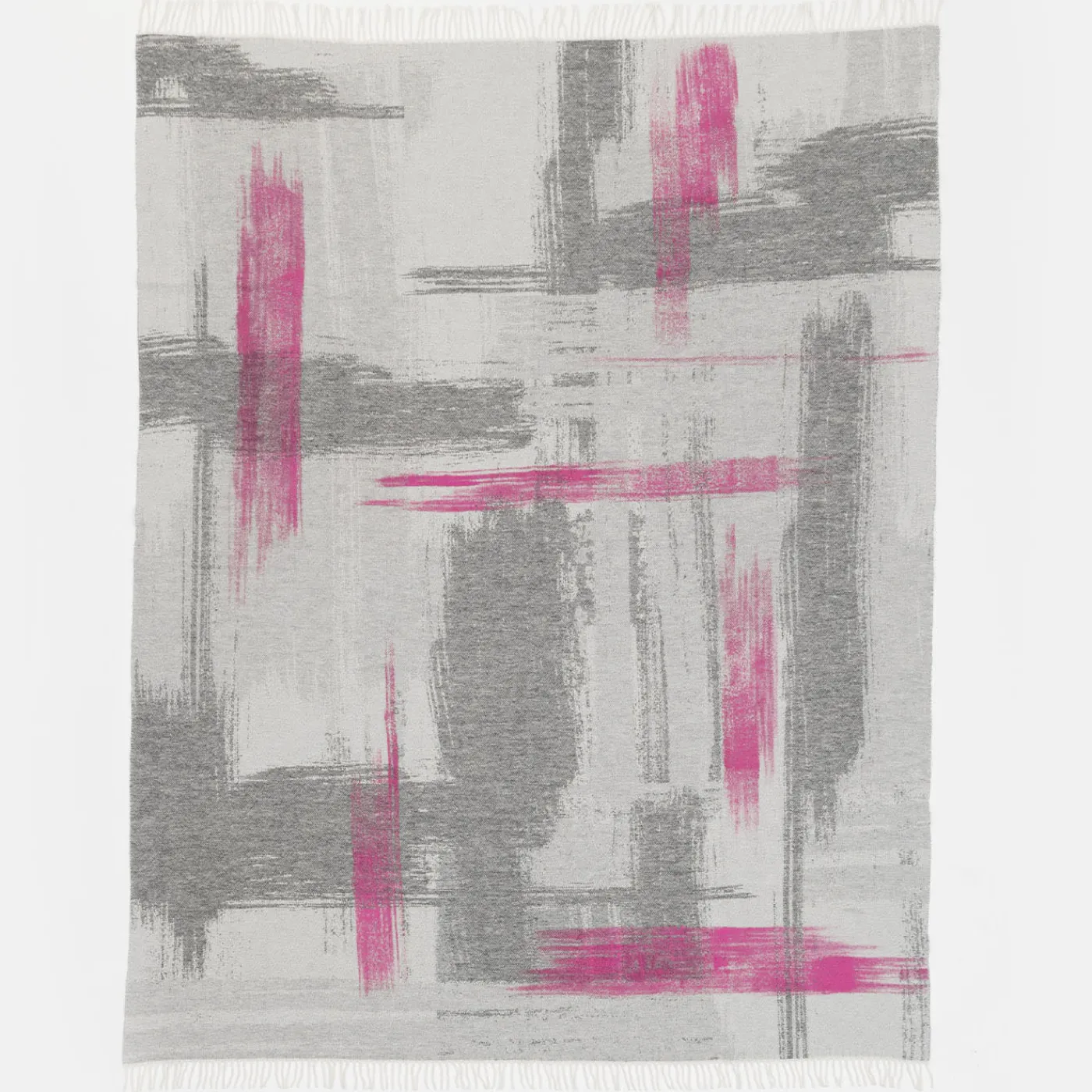 Una soluzione elegante per completare un letto o un divano contemporaneo, questa squisita coperta jacquard con frange colpisce per il suo fascino artistico. Il motivo grigio di pennellate sottende autentiche pennellate rosa dipinte a mano che la arricchiscono di un accento vibrante e femminile. Realizzata al 50% in cashmere e al 50% in lana Merino, garantisce un calore ineguagliabile.