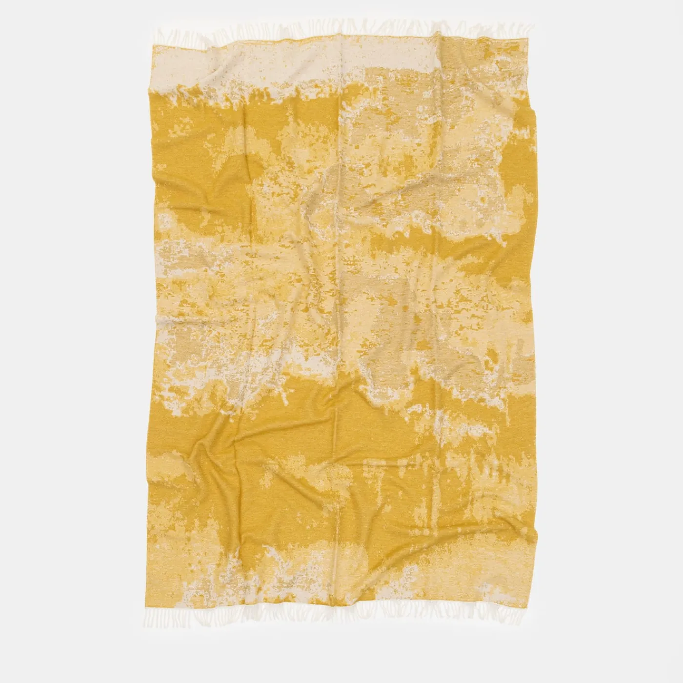 Questa esclusiva coperta, che colpisce per le sue ricche sfumature senape, sfoggia un intrigante motivo a gesso che cattura l’attenzione. Frange monocromatiche ornano i bordi, aggiungendo un pizzico di giocosità senza sovrastare il motivo generale. Tessuta con fili di lana all’85% e cashmere al 15%, è disponibile anche in versione rosa.