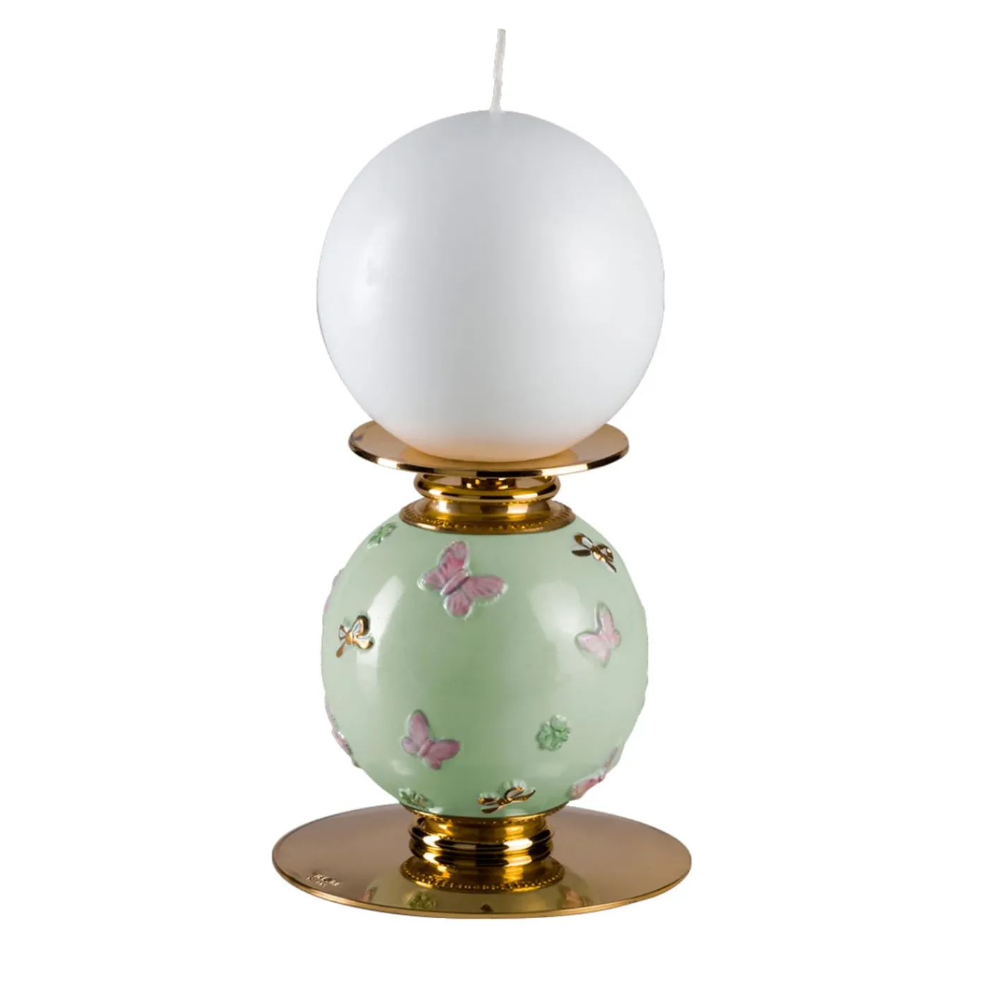 Il portacandele a farfalla piccolo presenta un design compatto con una base sferica verde pastello decorata con delicati motivi di farfalle rosa e oro. È sostenuto da una base e una piastra superiore in metallo dorato lucido, offrendo sia stabilità che un’estetica raffinata. Questo pezzo è progettato per contenere una sola candela e aggiunge un tocco sottile di eleganza e fascino a qualsiasi tavolo o mensola.