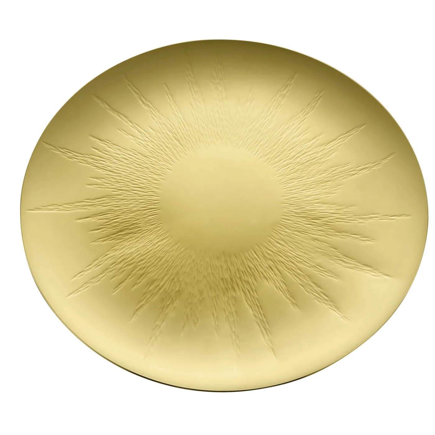 Questo elegante centrotavola è realizzato in acciaio inossidabile e la sua elegante silhouette rotonda e sottile è esaltata dalla finitura PVD che viene spruzzata sulla parte superiore dell’acciaio per conferirgli un colore dorato. La decorazione a forma di sole che ne adorna il centro è martellata sulla superficie, conferendo al piatto un’interessante texture ed evocando poeticamente la potenza e il calore della nostra stella più luminosa. Funzionale e decorativo, questo pezzo senza tempo può essere utilizzato in un arredamento classico o in un ambiente più contemporaneo.