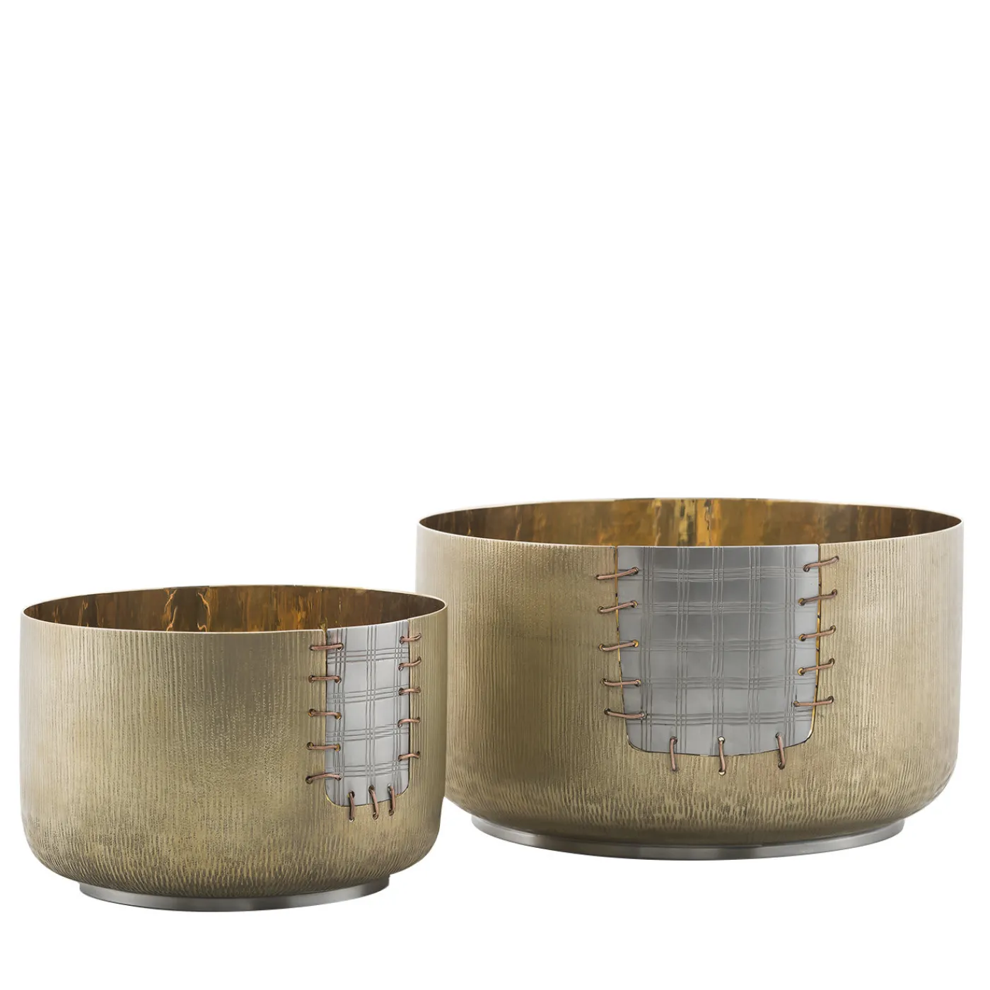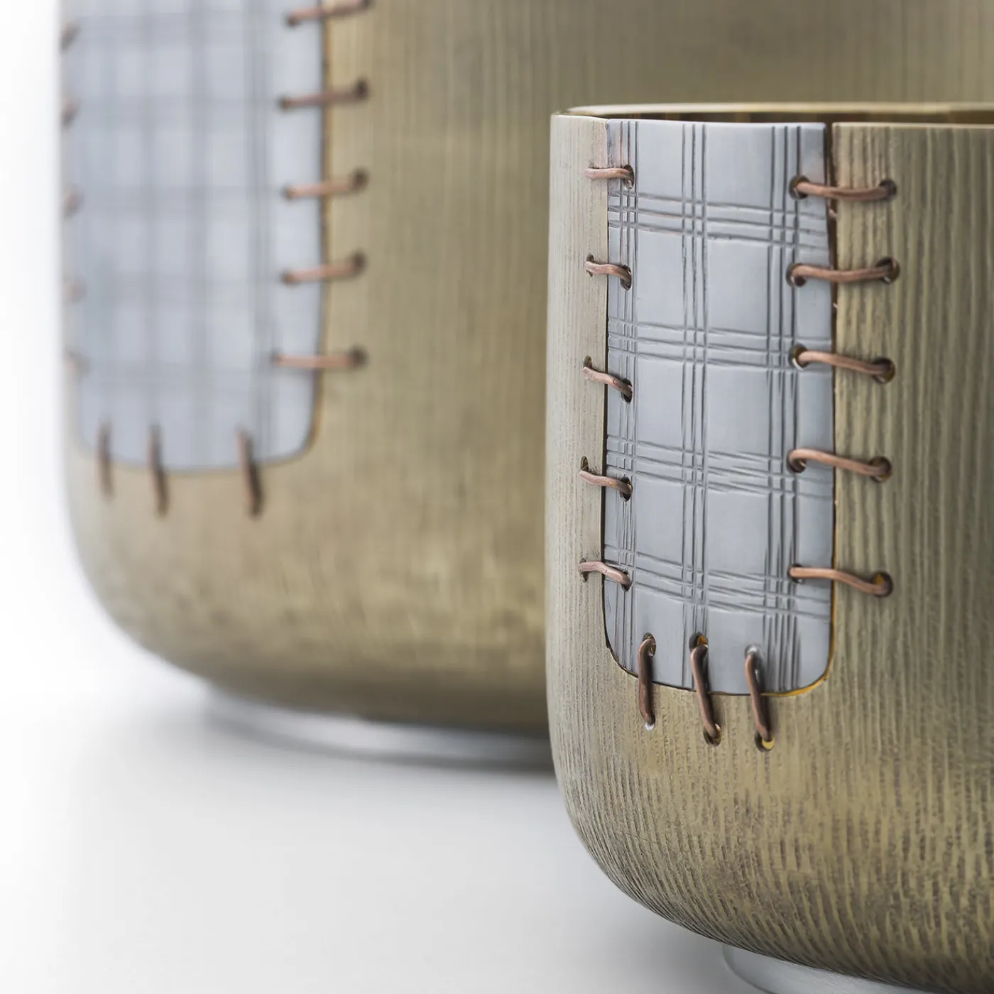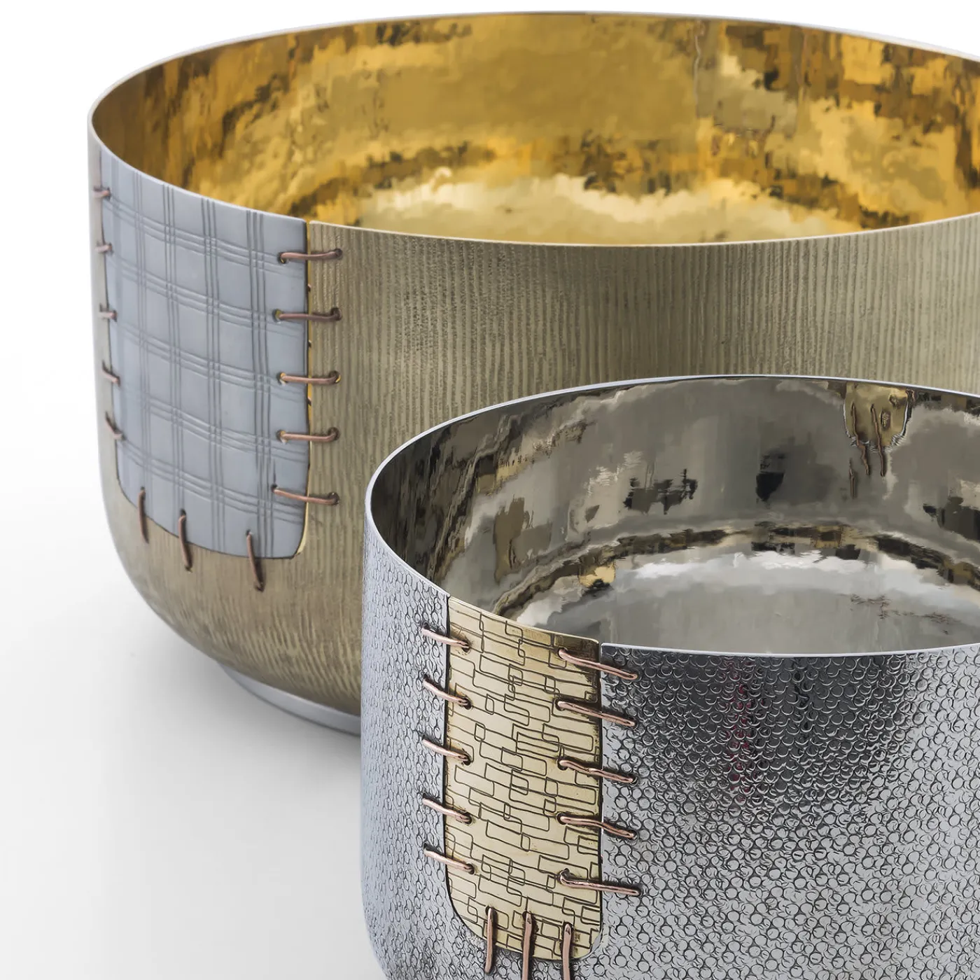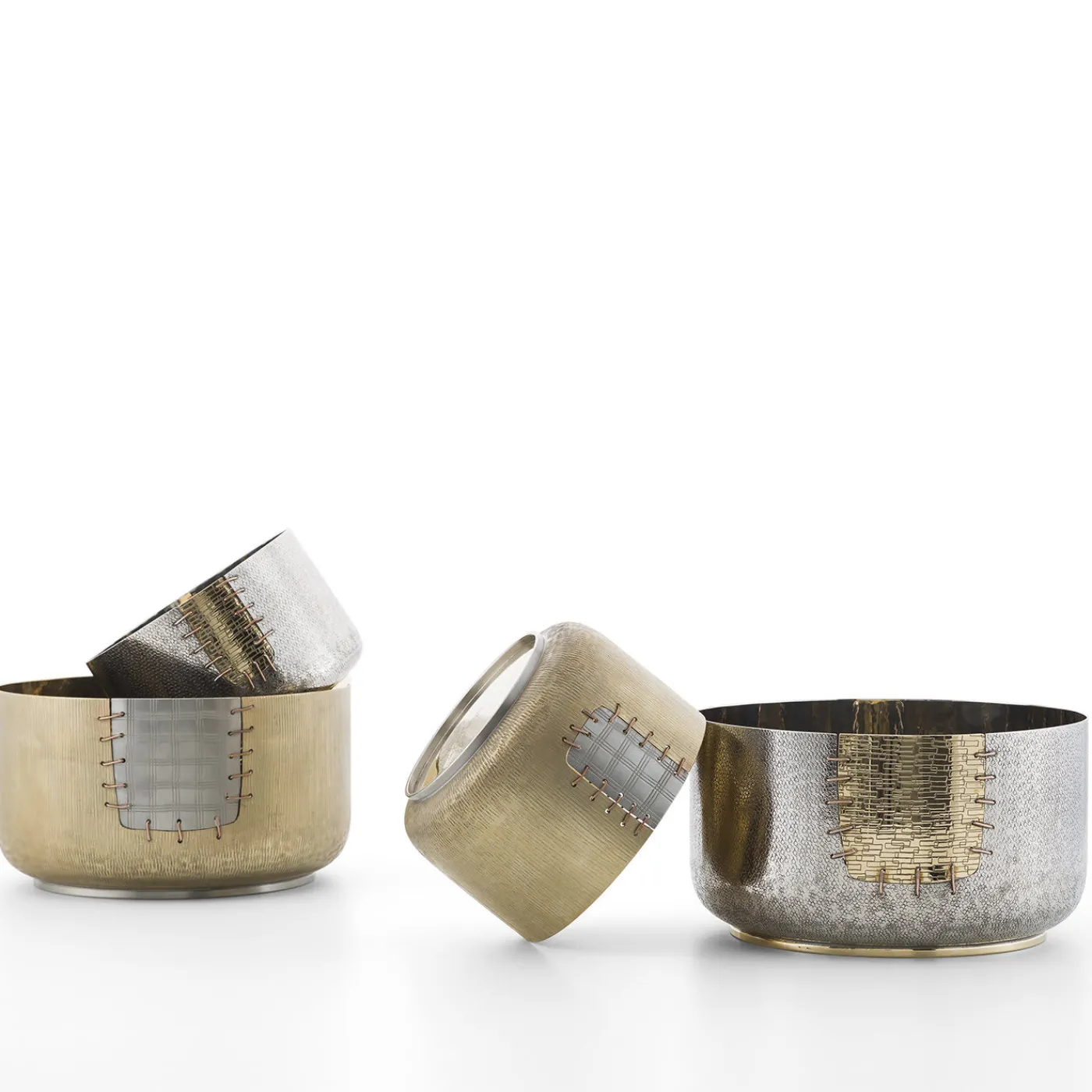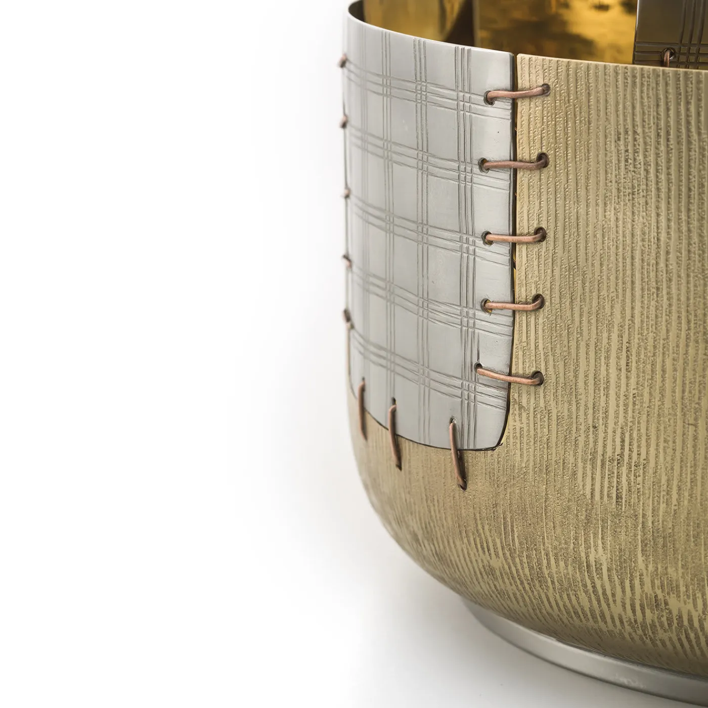 Ispirata al Kintsugi – una filosofia giapponese che considera qualsiasi taglio o danno a un oggetto un elemento di arricchimento che lo rende unico e prezioso – questa grande ciotola è realizzata in ottone, bronzo bianco e rame e vanta una toppa che sembra essere stata cucita per riparare il pezzo. La sua silhouette semplice e le dimensioni generose conferiscono al pezzo una qualità versatile che gli permette di essere un vaso, un centrotavola o una scultura decorativa da esporre ovunque in casa.