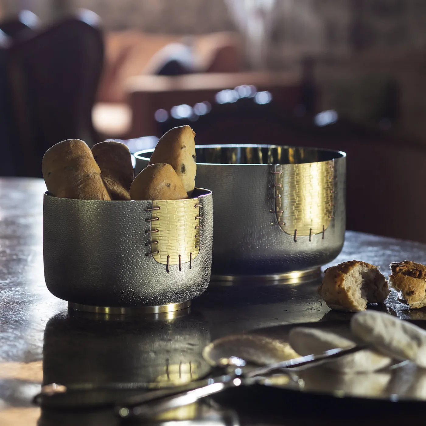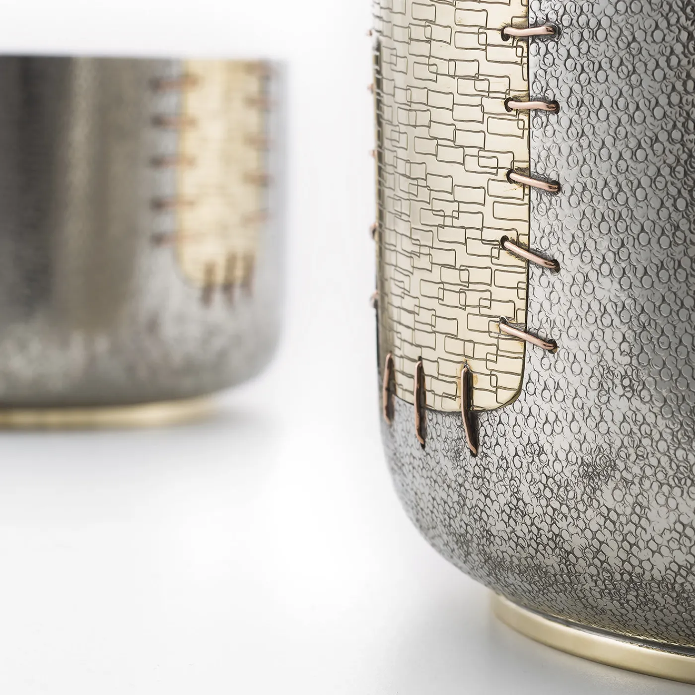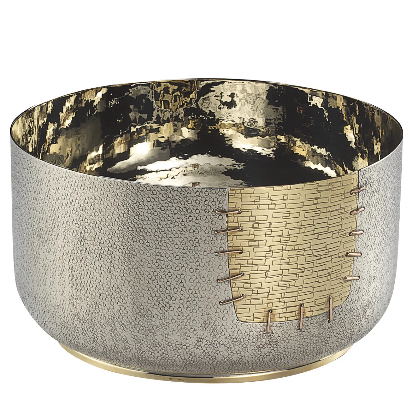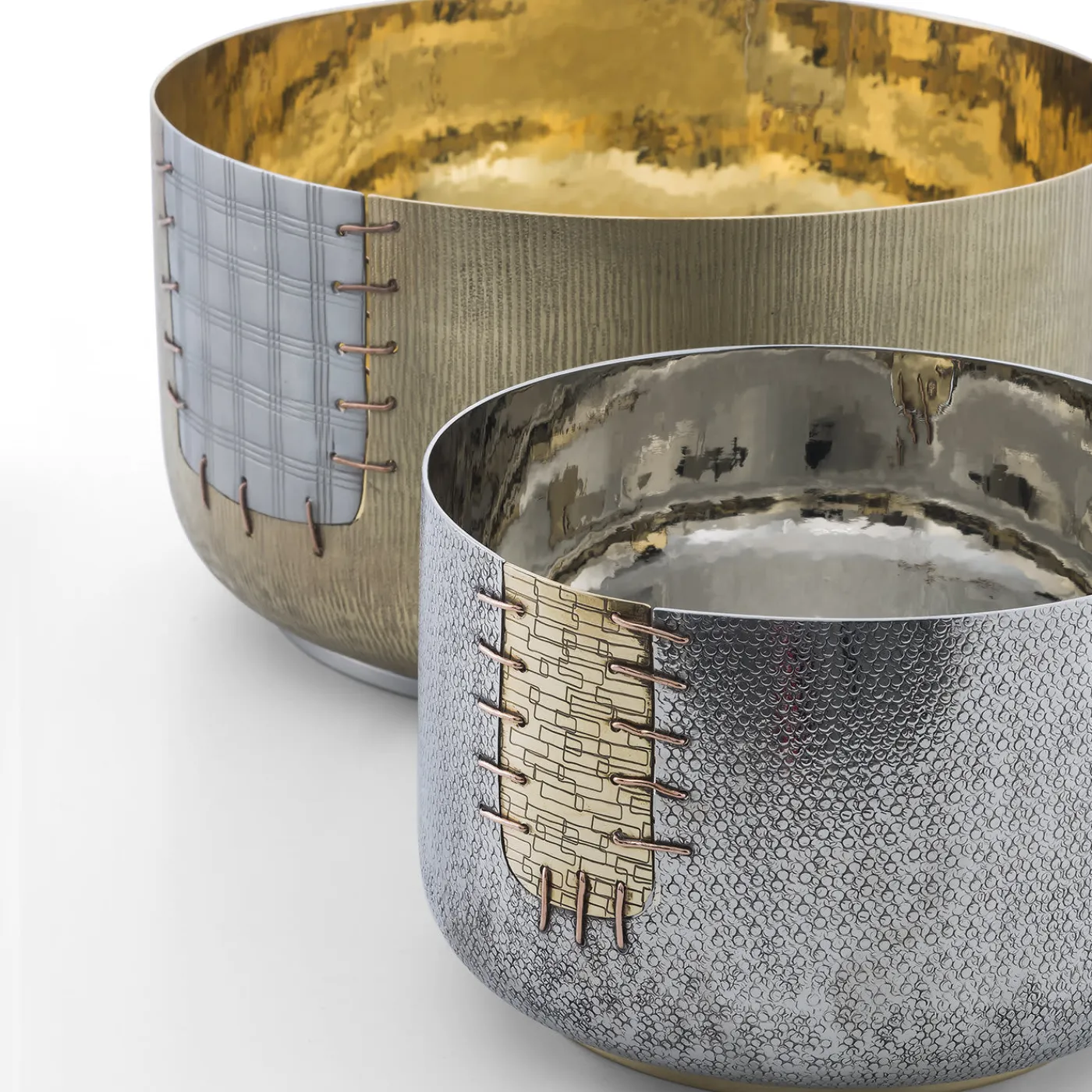 Ispirata al Kintsugi – una filosofia giapponese che considera qualsiasi taglio o danno a un oggetto un elemento di arricchimento che lo rende unico e prezioso – questa grande ciotola è realizzata in ottone, bronzo bianco e rame e vanta una toppa che sembra essere stata cucita per riparare il pezzo. La sua silhouette semplice e le dimensioni generose conferiscono al pezzo una qualità versatile che gli permette di essere un vaso, un centrotavola o una scultura decorativa da esporre ovunque in casa.