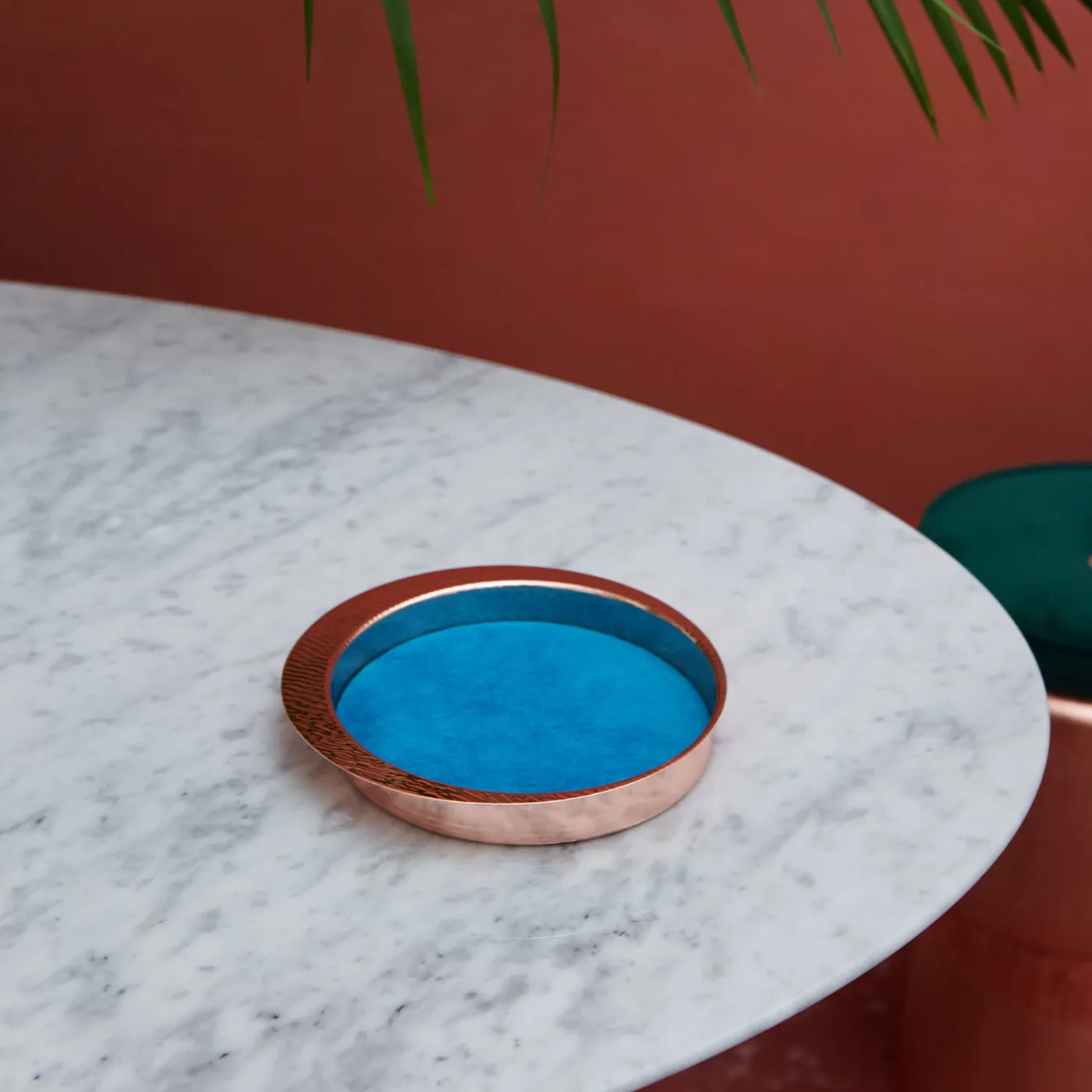 Abile vetrina di artigianato tradizionale resa in un sublime design contemporaneo, questo vassoio a tasca vuota aggiungerà un accento elegante a qualsiasi tavolo in un raffinato interno eclettico. Realizzato a mano in rame martellato con un motivo ad acqua dal fascino e dalla consistenza accattivanti, è arricchito da un cuscinetto interno rimovibile di colore azzurro, disponibile anche in rosa, bianco crema o blu. Su richiesta, questo design è disponibile anche in bronzo brunito, ottone dorato o lega d’argento.