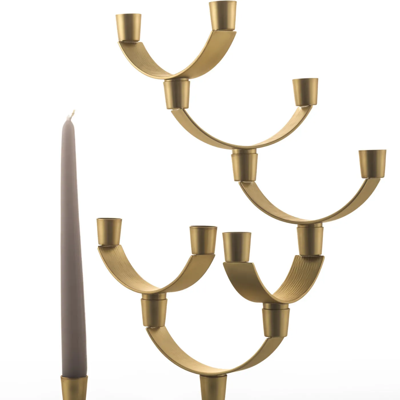 Questo pezzo di grande effetto è realizzato interamente in ottone con due diverse finiture: la base rettangolare è bronzata mentre i sette rami e le bocche semicircolari hanno una finitura satinata. L’abbinamento di queste due tonalità e la silhouette geometrica creata conferiscono a questo pezzo un fascino moderno. Altamente personalizzabile, i sette moduli che lo compongono possono essere disposti secondo le proprie esigenze e sensibilità.
