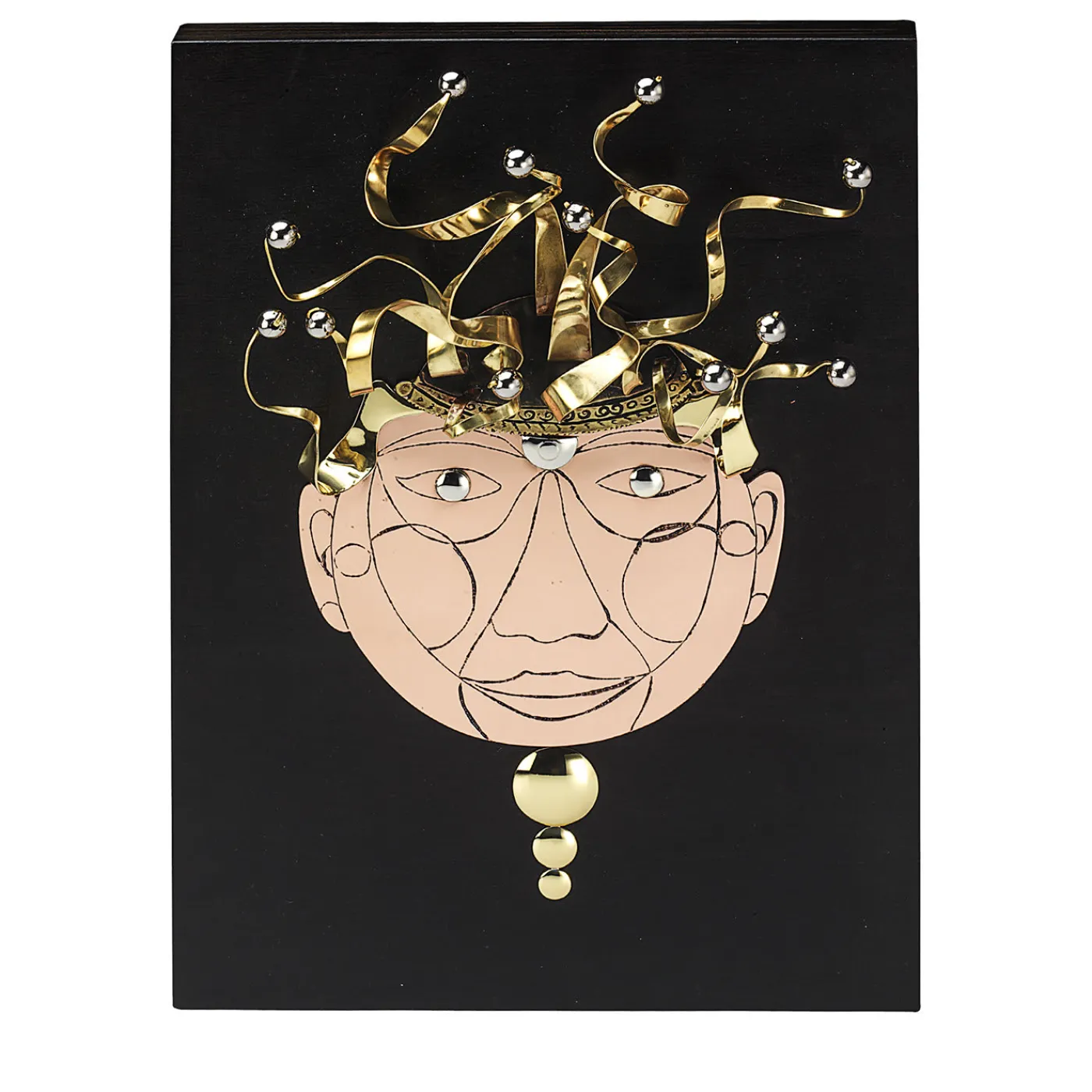 Accattivante opera di arredamento funzionale, questa sorprendente scultura da parete nasce dall’esigenza personale dell’artista Enrico Zanetto di espandere i propri orizzonti creativi. Realizzata interamente in ottone placcato oro, l’opera è una rappresentazione antropomorfa del sole, completa di occhi vivaci, capelli geometrici e linee dinamiche astratte. La placcatura in oro crea spettacolari riflessi nella luce del sole, producendo un effetto visivo sorprendente.